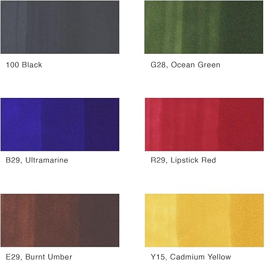 This 6 piece set focuses on darker-tone primary colors: 100, B29, E29, G28, R29, and Y15. A great companion to the Perfect Primaries set and is a must for your Copic marker collection.
