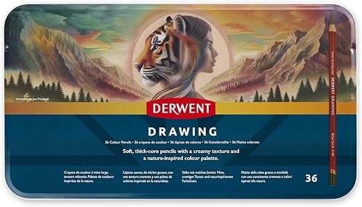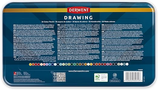 Contents: 1 x set of 36 Derwent Drawing colour pencils in a metal storage tin, creamy premium quality, 5mm round core, nature-inspired colours (2306557)